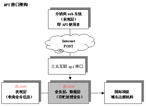 API接口(https://api.35.cn/api/)是基于三五互联业务系统开发,集域名注册、虚拟主机、企业邮箱、云服务器的实时购买开通API程序接口。 分销商自行开发web平台,独立拥有域名主机管理、数据管理、客户管理等平台。 三五互联作为上游注册服务商仅提供基于一定技术标准下的API接口调用程序服务。