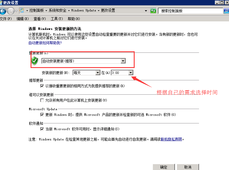 三、开启自动更新 有些服务器可能没有设置自动更新,处于安全考虑建议开启,设置方法: 点桌面上“我的电脑”》右键属性》Windows Update》,然后点“更改设置”,选择“自动安装更新”,所有值默认,如果有其他特殊需求可以更改,如下图所示:
