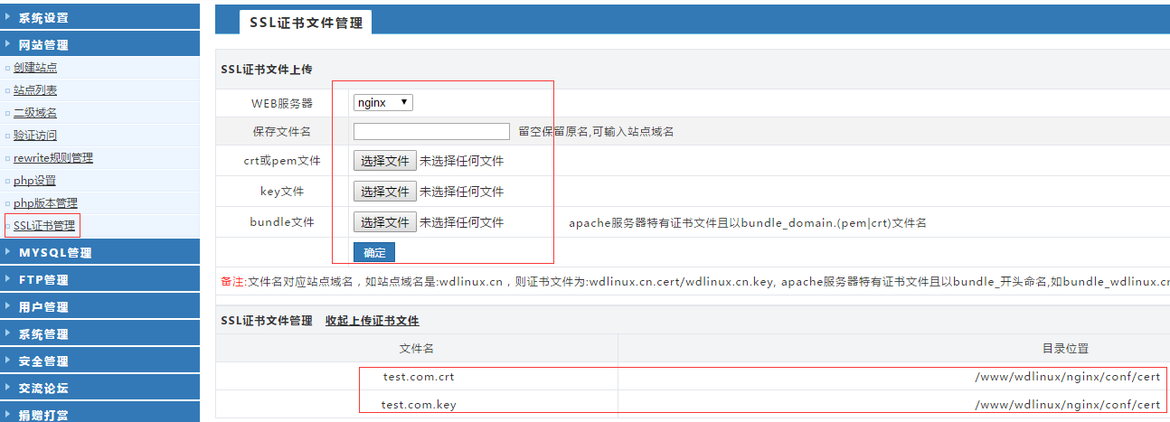 注意: 1、证书文件名必须和站点域名相同才能成功部署https(参考如附图)