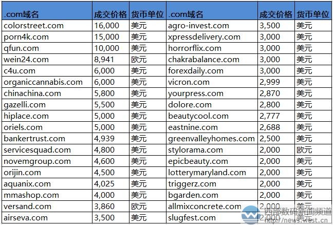 域名colorstreet.com注册于2001年,直译为“色彩街”,这个组合域名对应一款男士服饰品牌color street。而据whois信息显示,域名colorstreet.com背后的买家是一家名为Innovative Cosmetic Concepts的公司,官网域名为incoco.com。据网站内容来看,是一家创意美甲公司,旗下服务女性的项目color street目前正在建站中,官网启用域名colorstreet.com。 紧随其后的也是组合域名porn4k.com,成交价为15,000美元,约合人民币10万元。作为一个单词、数字、字母组合的杂米域名,之所以能卖出五位数美元的价格,全是因为其成人网站的含义。这类域名引流作用巨大,所以价值一般较高。 排在第三的是qfun.com,成交价为10,000美元,约合人民币6.8万元。这个域名因为有“fun”(有趣,娱乐)之意,很适合搭建游戏、直播、视频等网站,像目前国内的弹幕视频网站acfun就与之相似。另外,英国护肤品牌奇思妙方(qfun)也与之对应。 除此以外,两字母+数字的组合域名wein24.com和c4u.com分别以8941欧元和6000美元成交,随后“中国中国”域名chinachina.com也以5800美元的价格榜上有名。
