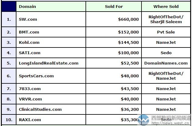 DN榜:极品域名sw.com以455万元霸气夺冠!多个短字符域名表现抢眼三五互联(35.com)5月11日消息,本期的DN交易榜(5.1-5.7)上,短字符域名表现抢眼,排名前10的域名中,7成域名皆是四字符以下的域名。其中,极品两声母域名sw.com以660,000美元的价格荣登榜首,约合人民币455万元。 域名sw.com注册于1994年,距今已有23年历史了。作为两声母域名,sw.com代表的含义非常丰富,有“商务、生物、上网、食物、丝袜”等含义,在英文里可以是“西南”(southwest)、视频教程Solidworks等多个组合词的缩写,可以应用的空间非常广泛,市场价值也相当不菲。据了解,域名sw.com是由知名经纪人Sharjil Saleem中介交易的,三月份他还经手了域名asset.com(资产)。 排名第二的是三字母域名bmt.com,成交价为152,000美元,约合人民币105万元。这个域名由海外信托公司Bryn Mawr Trust收购,官网域名为bmtc.com。虽然目前bmt.com尚未启用,但相比于bmtc.com,bmt.com更加简洁易记,便于输写,而且与品牌形象、官网logo等更加契合。 紧随其后的kohl.com,以144,500美元成交,约合人民币99.5万元。该域名注册于1996年6月,距今已有21年历史了,在英文里是人名“科尔”的意思。目前对应有美国著名的专业百货公司——科尔士百货公司 (Kohl’s) ,官网域名为kohls.com。 同样以六位数美元成交的还有cvcv型域名sati.com,成交价为100,000美元,约合人民币70万元。据悉,该域名此前由一家生活服务类软件公司持有,三月底域名sati.com还可以访问,不过目前由于交易已经完成,网站也以关闭。另一枚cvcv型域名rati.com也以35,300美元的成交价跻身榜单前10。 除此以外,三个组合域名也颇具看点,其中字符较长的longislandrealestate.com成交价为52,500美元,人民币大概是36万元。这个域名虽然较长,但“长岛地产”的含义非常清晰,用来搭建地方性房地产平台最合适不过的了。另外,sportscars.com(跑车)、clinicalstudies.com(临床研究)均超3万美元成交。 本文转载自新闻资讯,原文链接:DN榜:极品域名sw.com以455万元霸气夺冠!多个短字符域名表现抢眼