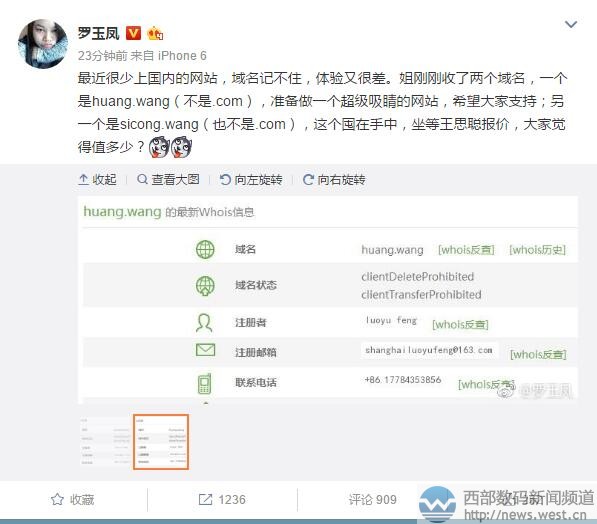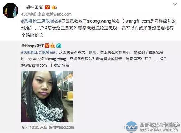 微博知名博主@一起神回复则发文说:罗玉凤收购了sicong.wang域名(.wang和.com是同样级别的域名),听说要卖给王思聪?要是我就送给王思聪,还可以向娱乐圈纪委变相行个贿哈哈哈!