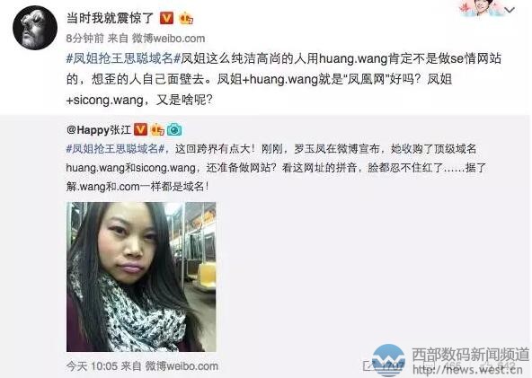 微博知名创意人@当时我就震惊了也发文了:凤姐这么纯洁高尚的人用huang.wang肯定不是做se情网站的,想歪的人自己面壁去。凤姐+huang.wang就是“凤凰网”好吗?凤姐+sicong.wang,又是啥呢?