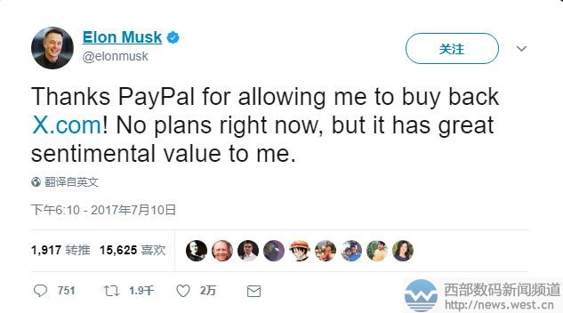 肥水不流外人田!极品域名X.COM又被Paypal前创始人买了回去三五互联(35.com)7月11日消息,上周我们报道全球知名支付工具Paypal疑似出售了极品单字符域名X.COM。近日,外媒曝出,该域名原来又被Paypal的前创始人Elon Musk买了回去,这可真是肥水不流外人田呐!