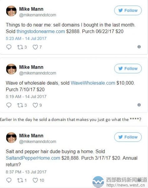 4天获利500倍!论域名玩得溜,我只服Mike Mann三五互联(35.com)7月14日消息,说真的,小编每次报道Mike Mann的交易消息时,内心都有止不住的羡慕嫉妒恨。尤其是今天这几个域名的交易,小编真的有一种“老大爷倒了都不扶”(不要当真),就服Mike Mann。