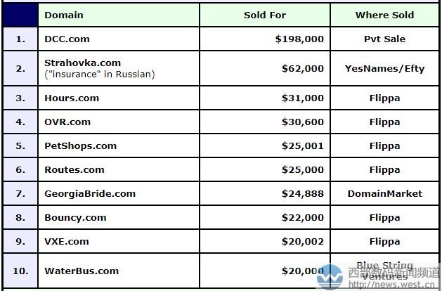 DN榜:三字母域名DCC.COM以134万元夺冠!“保险”域名被终端拿下三五互联(35.com)7月14日消息,本期的DN交易榜(7.3-7.9)上,高价成交的域名还不少,一扫往日夏季域名市场萧条的状态。本期夺得DN榜冠军的是三字母域名DCC.COM,成交价为19.8万美金,约合人民币134万元。 域名DCC.COM注册于1997年9月,距今快20年历史了。作为ABB型域名,DCC.COM品相出众,简短易记,而且又是三声母域名,对应诸多丰富词语,比如“多查查、调查处、冬虫草、搭错车、电磁场、大操场、电池厂”等,可广泛用于医疗、科学、信息查询、交通出行等领域,应用空间很大。据了解,域名DCC.COM是私下交易的,其高达134万元的成交价让其跻身目前为止今年成交价最高的20强域名之列。 排名第二的是域名Strahovka.com,成交价为62,000美元,约合人民币42万元。这个域名注册于2005年5月,是俄语中“保险”的意思,特别适合搭建保险行业终端网站。据whois查询,域名Strahovka.com已在7月7日转移到了终端买家payoneer.com名下。 随后是以31,000美元和30,600美元在Flippa平台成交的域名hours.com和ovr.com,约合人民币21万元。前者是英语常用单词,是“小时、时辰”的意思,可用来搭建服饰、美容、以及在线电商等终端网站,应用空间不错。后者ovr.com则有“哦VR”的意思,适合用于虚拟现实领域。 本期榜单的第五名来自英文组合域名petshops.com,成交价为25,001美元,约合人民币17万元。该域名早在1996年就已注册,其“宠物店、宠物商店”的含义清晰,指向明确,非常适合搭建宠物销售网站或者宠物其他相关服务平台。 另外,紧随其后的域名routes.com也拍出25,0000美元价格,该域名是“路径、路途”的意思,可搭建旅行相关平台。其他域名,比如 “快活”Bouncy.com、vxe.com、“水上巴士”waterbus.com、“洋葱”Onions.com、“打印、印刷”Print.net等也以不错价格成交。 其他交易域名详见下图: