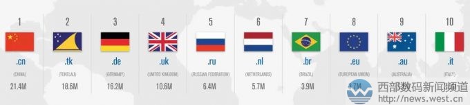 国别域名方面,截止到2017年第一季度末,注册总量为1.431亿个,环比增长03.%,同比增长1.7%。其中,中国国家域名.cn注册量突破2000万,达到2140万,是全球注册量最大的国别域名。紧随其后的是南太平洋岛国.tk域名,注册量为1860万。接着是德国国家域名.de以及英国国家域名.uk。