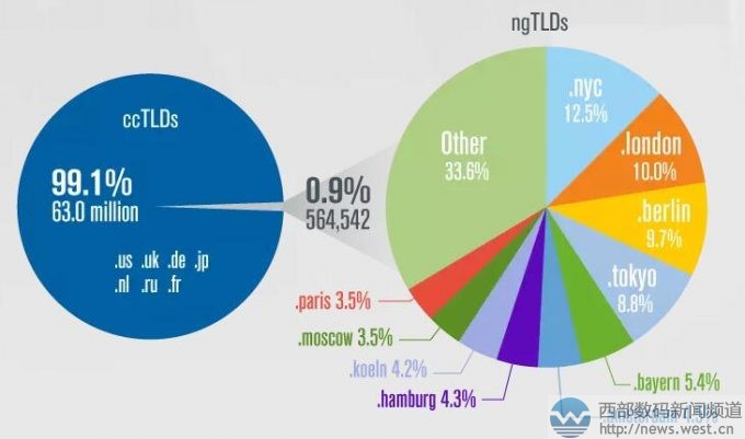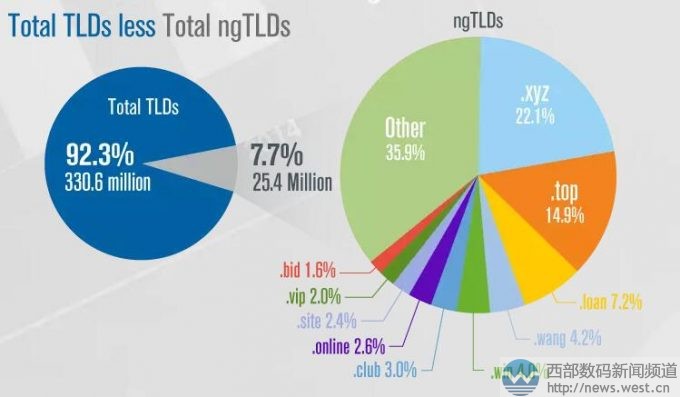 截至到今年3月31日,新顶级域名全球注册量总量达2540万,占全球域名注册总量的7.7%。而排名前10的新顶级域名注册量又占全球新顶级域名注册总量的64.1%。其中,排名第一的是.xyz域名,占新顶级域名注册总量的22.1%,随后是.top域名,占全球新顶级域名注册总量的14.9%,.loan域名、.wang域名以及.win域名分别次之。