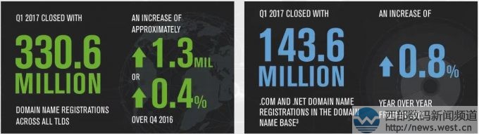 威瑞信发布2017年一季度域名行业简报三五互联(35.com)7月19日消息,域名运营注册局威瑞信今天对外发布2017年第一季度域名注册量简报,报告称今年一季度所有国际顶级域名注册总量达3.306亿个,其中截至到2017年3月31日,新增注册量为130万个,同比增长3.7%,环比增长0.4%。