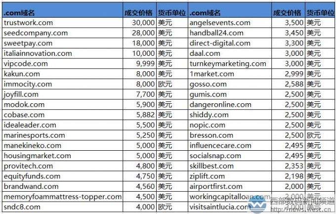 Sedo榜:“工作”类域名以20万元领衔!3个新顶级域名表现抢眼!三五互联(35.com)7月19日消息,最新一期的sedo交易榜出炉,本期上榜的域名共有65个,其中卖价最贵的是英文域名trustwork.com,成交价为30,000美元,约合人民币20万元。