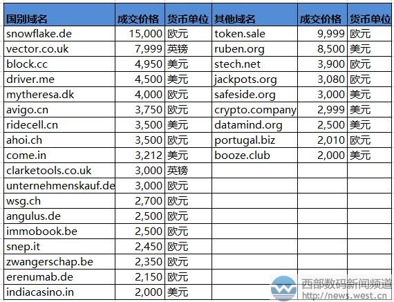 国别域名方面,来自德国的域名snowflake.de以15,000欧元结拍,约合人民币11.5万元。其主体英文snowflake却有“雪花、雪片”的中文含义,不少相关域名的成交价都不错。比如,snowflakedb.com曾在2014年被SnowFlake Computing(雪花计算)公司以近4万元的价格收购;英文域名snowflake.co.uk也在今年5月底拍出了约10.6万元的价格。 其他域名方面,本期三枚新顶级域名榜上有名。其中,token.sale有“代币销售”的意思,很适合搭建虚拟货币电商类平台,成交价为9,999欧元,约合人民币8万元。同样适合虚拟货币领域的还有域名crypto.company,成交价为2,999美元,该域名有“加密公司”的意思,可用于加密货币平台。除此以外,新顶级域名booze.club也以2000美元的结拍价上榜。 本文转载自新闻资讯,原文链接:Sedo榜:“工作”类域名以20万元领衔!3个新顶级域名表现抢眼!