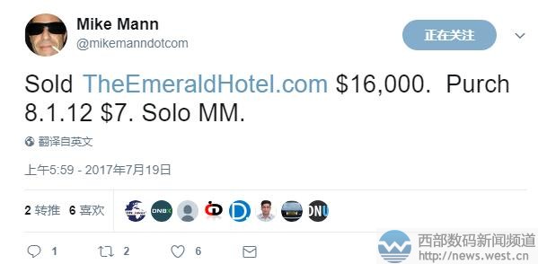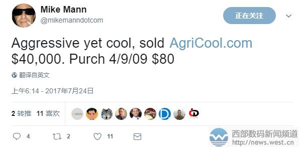 成本仅80美元!Mike Mann以27万元售出“农业”域名三五互联(35.com)7月25日消息,昨天国外大佬Mike Mann发推称,英文域名AgriCool.com以40,000美元成交,约合人民币27元。而这枚域名当时的成本仅为80美元,人民币539元。