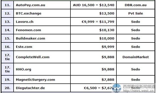 单字符j.de数量极为稀少,字母J在英文里有“jewelry”(珠宝)之意,在中文里对应有“家、金、价、酒”等诸多含义,而且可与之组合的词语也十分多,应用空间相当广阔。 紧随其后的是三字母域名ani.com,拍出49,0000美元,约合人民币32万元。该域名注册于1994年,距今已有23年历史。该域名字符简单好记,在英文里有“黑杜鹃”之意,同时还对应有法国巴黎的高端化妆品牌ani以及日本的anitoys动漫商城。目前访问域名ani.com,发现该域名正在建站中,不过由于隐私保护的原因,终端买家的身份还不得而知。 德国域名风采当头,澳大利亚域名也不甘落后。长尾域名urban.com.au以63,500澳元(48,260美元)成交,约合人民币31.9万元。主体urban是“城镇、都市”的意思,适合搭建地方门户网站。同样榜上有名的澳大利亚域名还有autoPay.com.au,成交价为16,500澳元(人民币8万元),其含义为“自动支付”,天然适合搭建支付类平台,用在金融领域很合适。 本期跻身前10的国别域名还有OCL.co.uk,成交为12,000英镑,人民币大概是11万元。主体可以对应许多终端品牌缩写,后缀为英国国家后缀,适合用来品牌升级。另外瑞士域名Lavoro.ch超1.1万美元结拍,约7.6万元。另一个德国域名Diegutachter.de结拍于6500欧元。 除了国别域名,两枚数字域名也拍出不错价格。其中,四数字的2906.com以21,900美元成交,约合人民币14.5万元;五数字域名97222.com则因品相突出也拍出13,000美元。这两个域名字符都较为简短,在全球范围内又属于硬通货,可广泛用于金融、游戏、娱乐、门户以及网址导航等多个平台。 其他域名成交情况,详见下表: