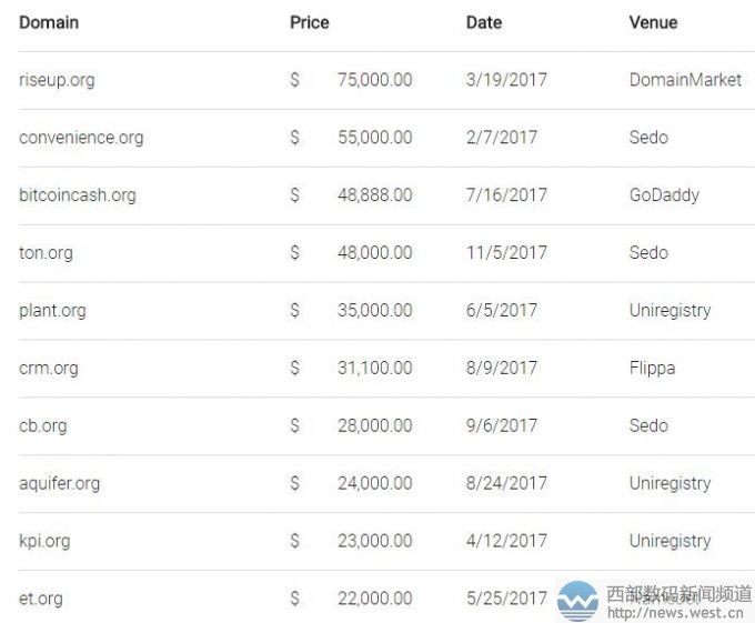 域名riseup.org是“上升、耸立、起来”的意思,对应一首经典的英文歌曲《rise up》。据了解,该域名由域名大佬Mike Mann出售,最初的成本价仅为350美元,最后却以48万元成交,还一跃成为2017年成交价最贵的.org域名。 紧随其后的是以55,000美元成交的域名convenience.org,约合人民币35.6万元。该域名具有“便利方便、便利设施”等含义,虽然字符较长,但却是非常通用的英文单词,很适合搭建电商、以及生活服务类平台。 随后是一枚“比特币现金”域名bitcoincash.org,成交价为48,888美元。毋庸置疑,这是一枚妥妥的行业米,很适合搭建比特币交易网站。2017年比特别行情涨势迅猛,相关域名成交价也水涨船高。 排在第四的ton.org域名,成交价为48,000美元。该域名既可看作普通三字母域名,也可视为英文域名,有“吨、许多、大量”等含义,同时还对应有知名时尚博主兼摄影师Tommy Ton的名字。目前与之对应的终端有时尚女装品牌The Ton,同创互联(toncom)等。 排在第五的是域名plant.org,成交价为35,000美元。该域名具有“工厂、设备、植物、草木”等意思,在英文国家中是比较通用的英文单词,适合花卉类网站平台。 另外,几个短字符域名crm.org、cb.org以及kpi.org、et.org等域名均超20,000美元成交。其他更多域名交易情况,详见:https://www.strategicrevenue.com/org-year-in-review-2017-top-100-highest-reported-org-domain-sales-namebio/