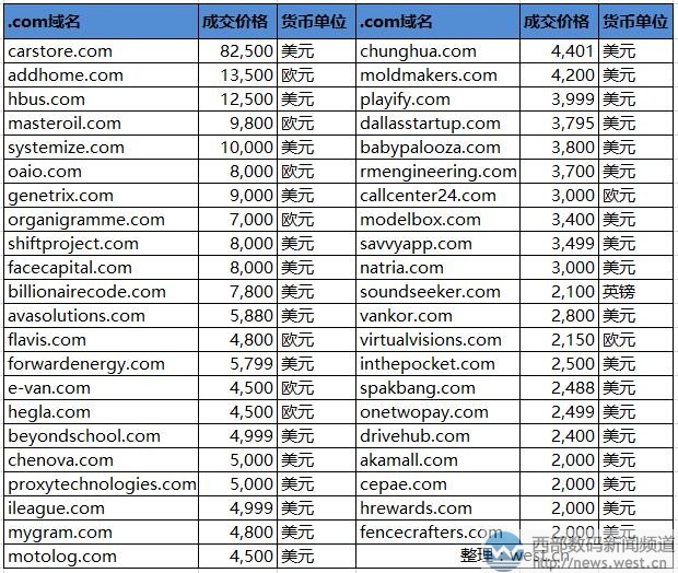 .com域名方面,本期共有五个域名超五位数成交。其中,成交价格最高的是英文组合域名carstore.com,价格为82,500美元,约合人民币52万元。该域名主体由单词“car”(汽车)和“store”(商店)组合而成,很适合搭建汽车电商,应用价值不俗。目前对应有台湾汽车百货(carstore.com.tw)。 排名第二的是以13,500欧元成交的域名addhome.com,约合人民币10万元。含义上,该域名具有“加上家”的意思;应用方面,除了对应有苏州诚品生活展以外,还有欧洲搬家公司Add home,其官网域名为add-home.eu。 紧随其后的是四字母域名hbus.com,成交价为12,500美元。该域名由字母“H”和“bus”(汽车)组成,除了对应HBUS通讯技术、H-Bus 智能家居系统以外,也可以用于汽车类终端,毕竟“bus”一词常见通用,用在汽车领域很有优势。 除此以外,masteroil.com和systemize.com分别以9,800欧元和10,000美元成交,前者有“大师油”之意;适合搭建食用油品牌;后者是“系统化”的意思,没有特定的行业指向,适合多个领域建站使用。
