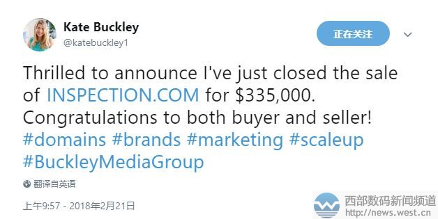 花212万元升级域名!亚洲质检收购Inspection.com2月22日消息,昨天早上域名销售公司Buckley MediaGroup CEO在推特上曝料称,域名Inspection.com以335,000美元达成交易,约合人民币212万元。经查询发现,该域名背后买家乃是亚检质量检测有限公司Asia Inspection。