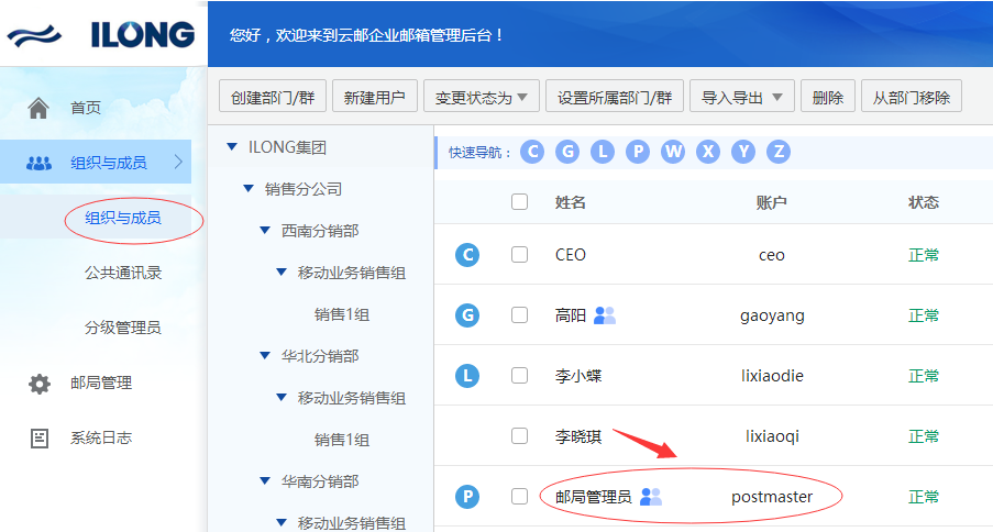 1、登录企业邮局,点击顶部“邮局管理”。在邮局管理中点击“组织与成员”,在用户列表中,点击“邮局管理员”(postmaster)。