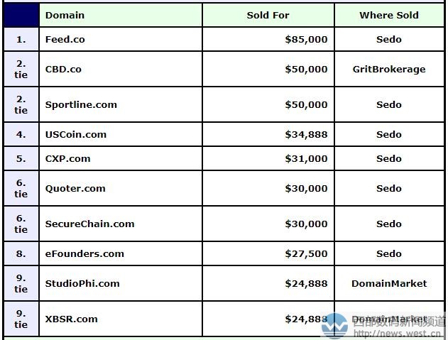国别域名大出风头:feed.co和CBD.co六位数领跑DN榜!6月21日消息,昨天外媒公布了新一期的DN域名交易榜(6.4-6.17),本期榜单上两枚哥伦比亚域名feed.co和CBD.co颇为惹眼,分别夺得冠、亚军。