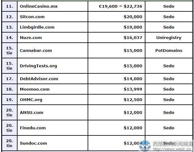排在第一的域名feed.co在Sedo平台以85,000美元成交,约合人民币55万元。该域名注册于2010年,具有“喂养、满足”的意思,是一个非常通用常见的英文单词,适合用于搭建美食网站等终端平台。 排在第二的域名CBD.CO经由Grit Brokerage中介成交,价格为50,000美元,约合人民币33万元。作为三声母域名,CBD.CO可挖掘的含义较为丰富,也是不少英文组合的缩写词,比如“中央商务区”(Central Business District)、“订金”(Cash Before Delivery)等,除此以外还,对应有包括知名床垫品牌CBD家居(cbd88.cn)等在内的不少终端。 以50,000美元并列第二的还有英文组合域名sportline.com,该域名有“体育在线、运动在线”以及“动型”的含义,比较适合搭建体育赛事直播网站、体育健身平台等。目前,该域名的潜在终端包括宝马sportline车型、化工厂Sportline(斯博耐)等。 随后是以34,888美元成交的组合域名uscoin.com,该域名由“US”和“coin”组合而成,有“美国硬币”之意,很适合搭建数字货币类交易平台或金融支付平台等,市场价值不错。 接着是三声母域名CXP.com,成交价为31,000美元,约合20万元。该域名有“促销品、畅销品、查询票、抽象派”等含义,可搭建网络促销平台、票务查询网站、艺术平台等。 其他更多DN榜域名交易情况,详见下表: