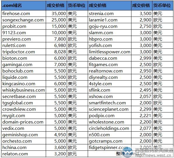 按照惯例,我们还是先来看.com域名。本期sedo榜上,成交价最高的com域名来自英文域名firehose.com,交易价为35,000美元,约合人民币27万元。该域名属于行业词汇,直译为“消防水带”,目前对应有前端开发公程师培训平台Firehose Project,官网域名为thefirehoseproject.com。 紧随其后的也是一枚英文组合域名songexchange.com,该域名由“song”(歌曲)和exchange(切换)组合而成,成交价为25,000美元,约合人民币19万元,很适合搭建音乐类软件平台。 除此以外,域名probit.com和91123.com分别以15,000美元和10,000美元成交。前者对应一种广义上的线性模型——probit模型;后者是五数字域名,属于硬通货,在建站方面没有限制。