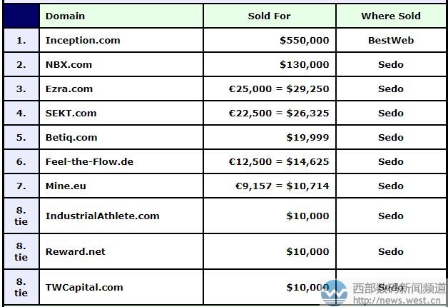 昂贵的“开端”:英文域名inception以366万元居DN榜首7月13日消息,新一期的DN域名交易榜昨天出炉,本期榜单上超六位数美金成交的域名有两枚,分别是inception.com(550,000美元)和NBX.COM(130,000美元)。