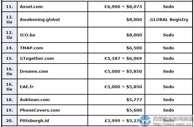 域名inception.com注册于2002年7月,已通过Bestweb平台完成交易,成交价为550,000美元,折合人民币366万元。该域名是英文“开始,开端,初期”的意思,是比较常用的英文词汇,由于没有特定的行业倾向性,适合多个领域建站使用。目前,与之对应的有电影《盗梦空间》(inception)和网络模型Inception。 随后是刚在sedo交易榜上位居首位的域名NBX.COM,成交价折合人民币为87万元。这个三声母域名注册于1995年,可挖掘的含义较大,不过比较引人注目的还是其含有“牛逼、牛币”的意思,前者是网络热词,后者更是对应当前火热的虚拟货币领域,其市场价值也就不言而喻了。 接着是两枚四字母域名ezra.com和sekt.com,成交价分别为25,000欧元和22,500欧元。前者在英文中是人名“埃兹拉”的意思,与之对应的终端有斯拉控股集团(Ezra Holdings),其官网启用域名ezraholdings.com;后者对应有德国葡萄酒里的“塞克特”起泡酒,作为酒类词汇,“sekt”在行业内较为通用,适合搭建相关起泡酒网站平台。另外,以19,999美元成交的betiq.com也值得关注,折合人民币超13万元。 除此以外,本期DN榜上两枚国别域名跻身前10,分别是德国域名feel-the-flow.de和欧盟域名mine.eu,成交价分别为12,500欧元和9,157欧元。其中,feel-the-flow.de直译为“感受气流”;域名mine.eu主体是非常通用的英文单词,有“矿井、地雷、我的”等意思。 其他域名交易情况,详见榜单: