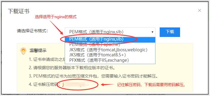 3.选择PEM格式,适合nginx的,然后点击下载。因为下载是rar的压缩包,因此请记住解压密码,下载后需要用密码进行解压。