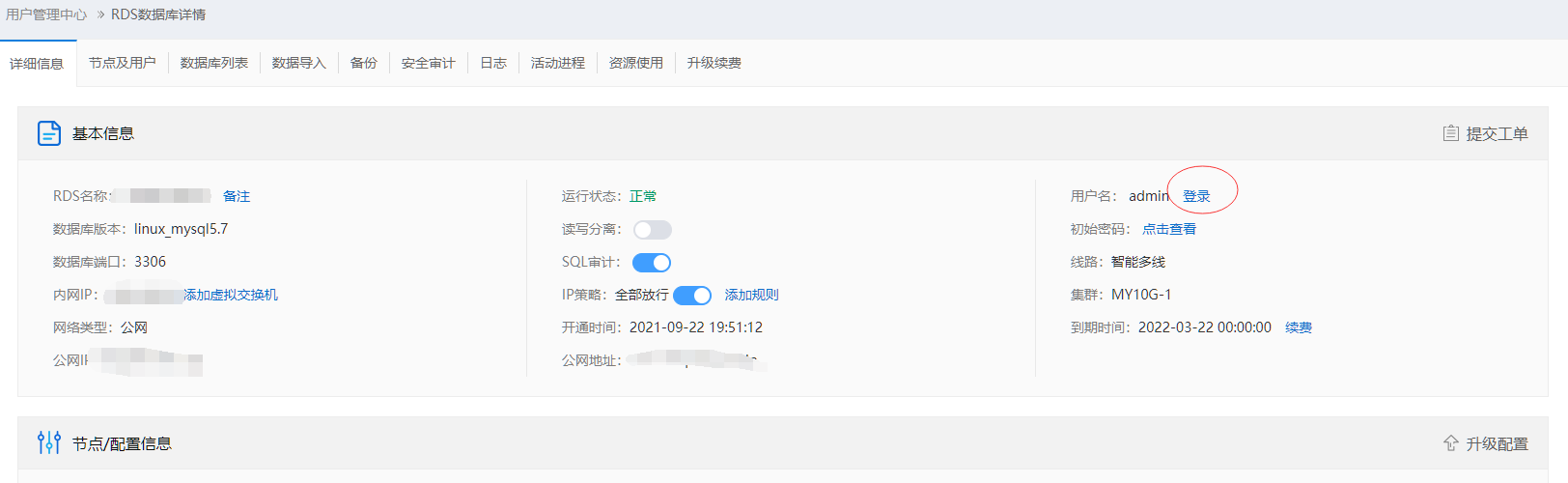 6.如何创建用户访问指定数据库用admin账户登录成功之后,使用语句 create user ‘test’@’%’ identified by ‘password’, 创建账号,再用 grant 权限 on 指定数据库名 .* to ‘test’@’%’ identified by ‘password’; 7.RDS开通并创建数据库后,在程序中如何使用?程序中用户是admin,密码通过后台获取,连接地址使用内网地址(如果有公网可以用公网地址,但建议建立逻辑私网参考4.2,用内网地址访问),端口用默认的3306。密码和内网获取如下图。