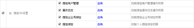 与微信OA有关的权限共4个:微信用户管理、操作日志、微信企业号绑定、微信绑定