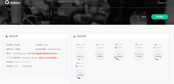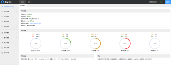 购买刺猬响站后,可在刺猬响站管理后台查看站点的网站信息,包含:网站状态、网站类型、有效期、语言版本、系统域名、绑定域名、网站资源及使用情况