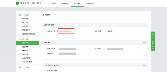 3.2获取微信支付参数成功申请小程序微信支付后,通过链接https://pay.weixin.qq.com 登录微信支付商户平台,获取商户号、商户密钥、下载API支付证书,各参数获取说明如下说明: 3.2.1获取商户号点击“账户中心”->“商户信息”菜单,获取微信支付商户号,如下图示;