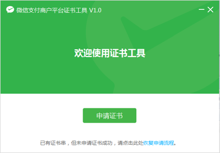 二、如何获取API证书注意:获取API证书需要商户号的超级管理员才能操作 1、点击API安全里的【申请证书】按钮,并点击下载去下载证书工具。 备注:也可直接访问该链接 https://wx.gtimg.com/mch/files/WXCertUtil-1.0.zip 下载证书工具