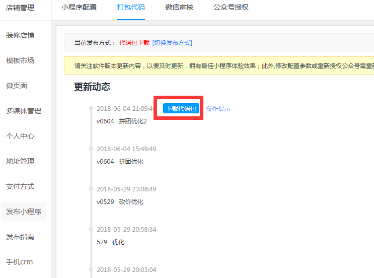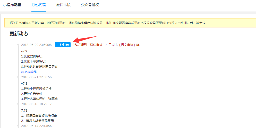 1.3在线更新打包授权绑定小程序后,在“打包代码”页面点击【一键打包】按钮打包小程序; 提示:请时刻留意该页面版本更新情况,及时更新最新软件版本,达到最佳体验效果。