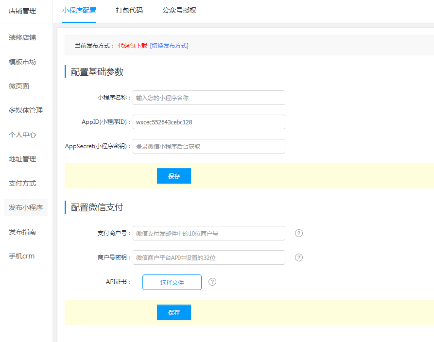 2.代码下载代码包下载是在平台上下载小程序代码包,自行通过微信开发者工具上传代码并通过微信公众平台完成小程序审核、小程序发布操作,适合对微信小程序较熟悉的用户。 2.1配置小程序参数登录管理后台,点击【店铺】菜单->点击【发布小程序】->点击【小程序配置】,配置小程序的参数:小程序名称、AppID、AppSecret,AppID与AppSecret可登录微信小程序后台——设置——开发设置中获取;