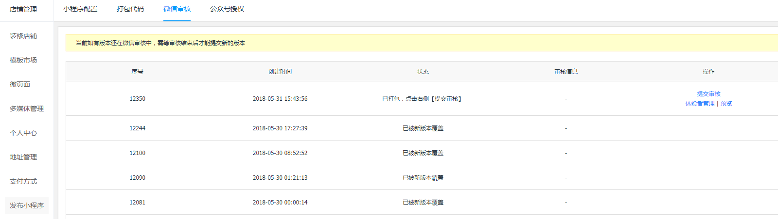 预览后,点击提交审核,将小程序提交到提交到微信进行审核。等待微信审核通过后,回到本页面可以进行小程序发布。如审核不通过,需要根据微信审核意见进行修改并重新提交审核。注意,同一时间只能有一个小程序在审核中。