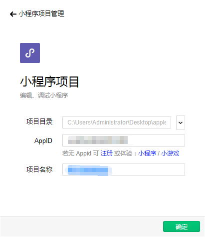 选择项目目录,找到并选择刚解压的小程序文件夹,点击确定进行添加并输入小程序的AppID和项目名称