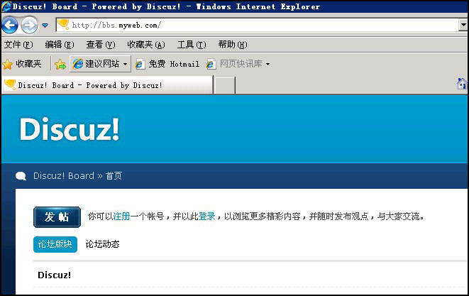 至此新建子站的过程就结束,可以用您的子站域名如:bbs.myweb.com来访问测试下,如图: