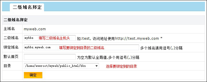 绑定域名:填写完整的要访问的域名,如要用mybbs.myweb.com访问就填写mybbs.myweb.com,不用加http://