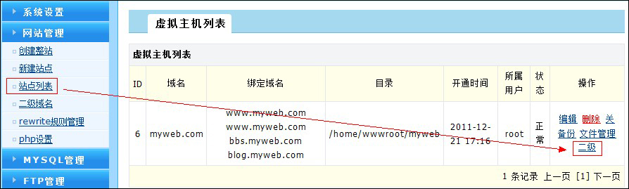 首先登录WDCP管理面板,点击左侧的“网站管理”——“站点列表”,在站点列表选择您要绑定二级域名的站点,点击右侧的“二级”,如图: