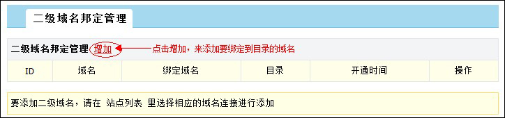 在“二级域名绑定管理”中,点击“增加”,如图: