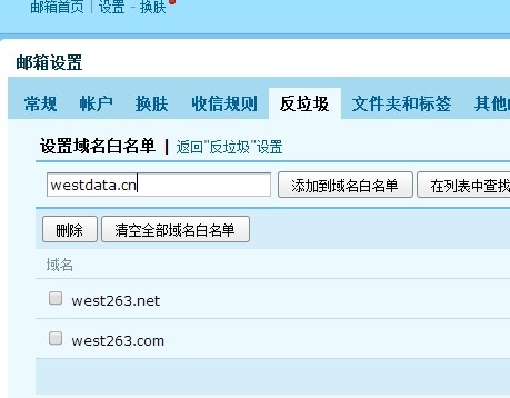 2.在 反垃圾邮件--白名单--设置域名白名单 3.添加域名35.net 到白名单里面保存 (我们的发件地址为 noreply***@35.net )