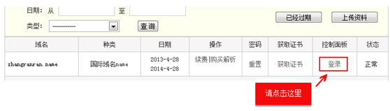 3.进入域名管理页后,在页面右侧下方找到修改DNS的域名,并点击【登录】,登录控制面板。