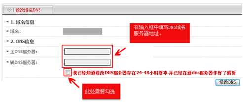 5、在输入框中填写域名DNS服务器地址,并勾选“我已经知道……”协议后点击【修改DNS】按钮。