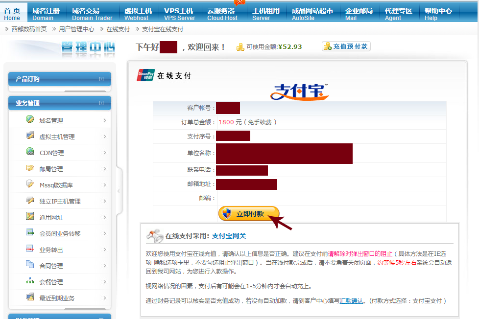 最后,根据提示完成在线支付即可! 注意:支付完成后,请仔细查看浏览器提示,并耐心等待浏览器返回,大约返回需要5秒钟时间! 支付宝各银行信用卡在线支付限额说明:http://fun.alipay.com/xykcz/index.htm