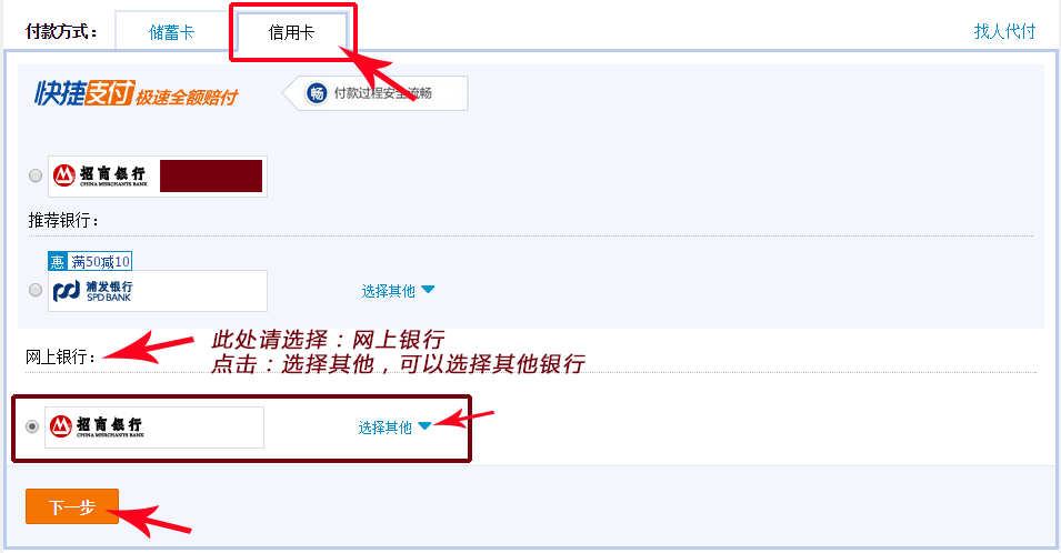 4.选择信用卡选项,选择网上银行,并选择对应的银行!如下图所示!